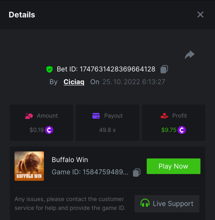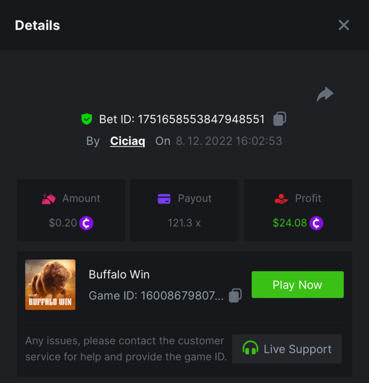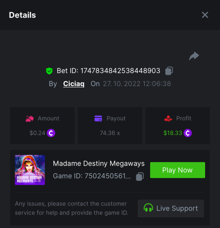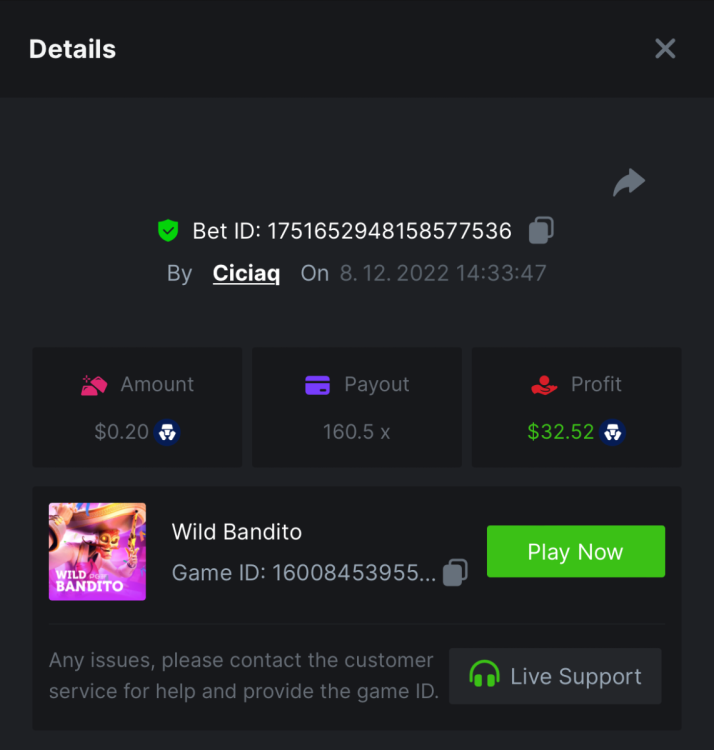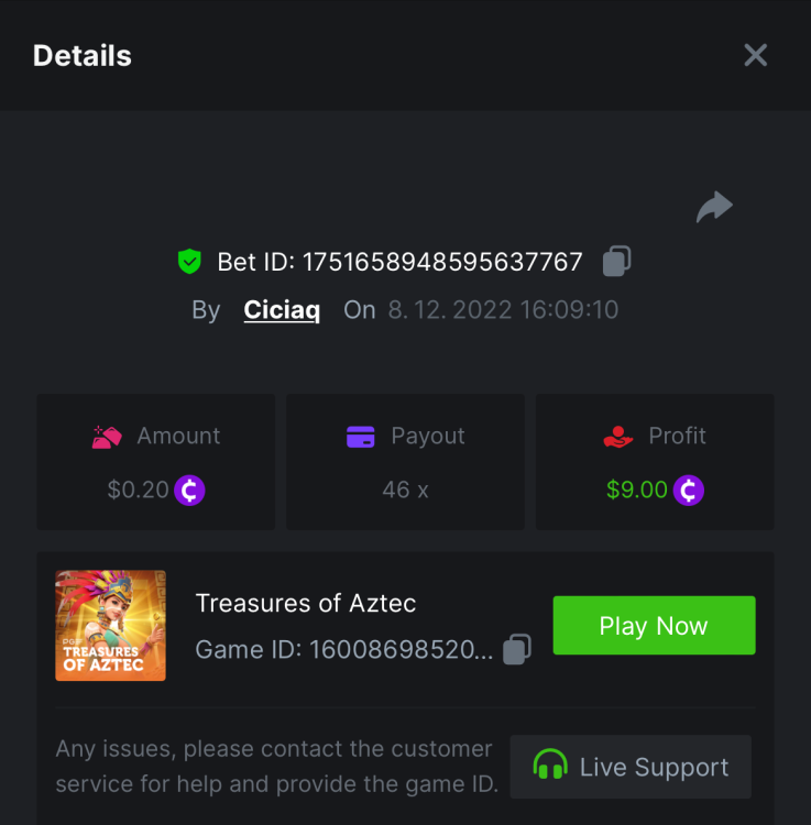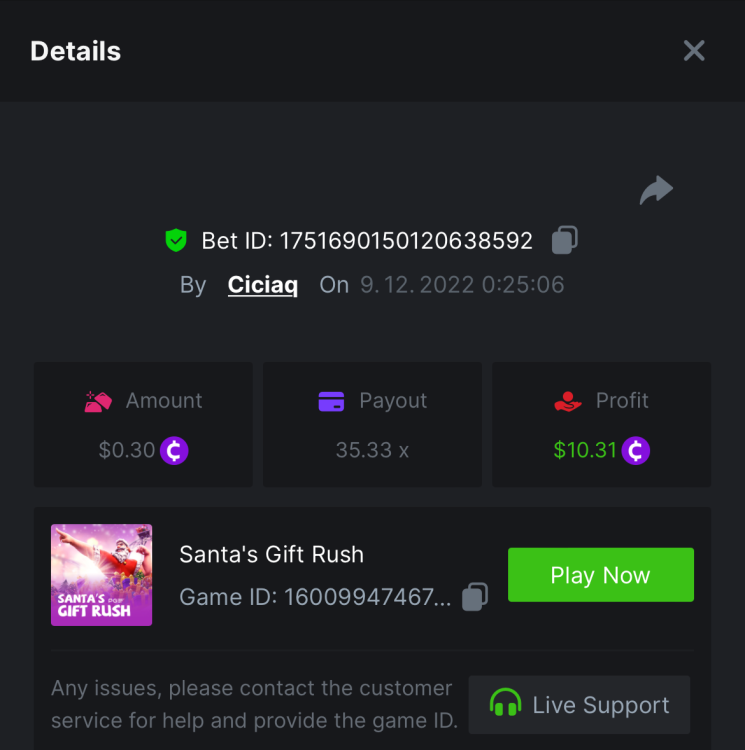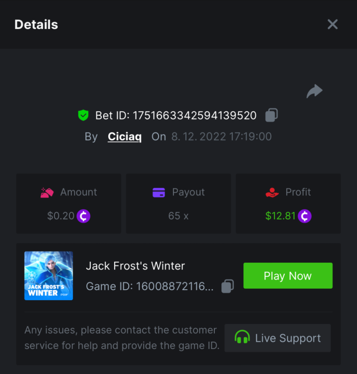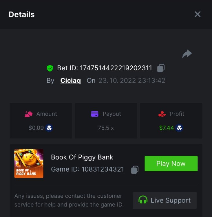 1. Book of Elves - 280.78x https://bc.game/#/sd/10ZK2Y591AUFWZ Book of Piggy Bank Riches - 537.5x https://bc.game/#/sd/10ZJC3O9P52J9V Wolf Fang - Golden Sands - 102.33x https://bc.game/#/sd/10ZEGDKTFN3J83 Athena's Glory - 135.67x https://bc.game/#/sd/10ZK8GPA2RAXAR Hut with Chicken Legs - 140x https://bc.game/#/sd/10ZC6PR7G57PQR Bounty: https://bc.game/#/sd/10ZDBH1IA77MZ7