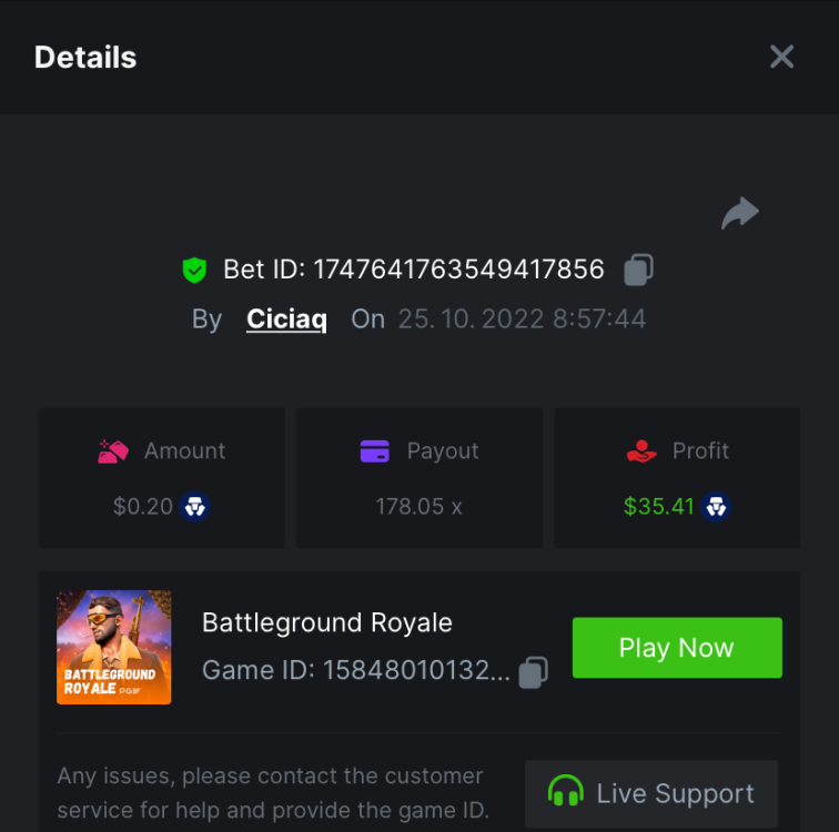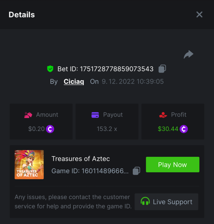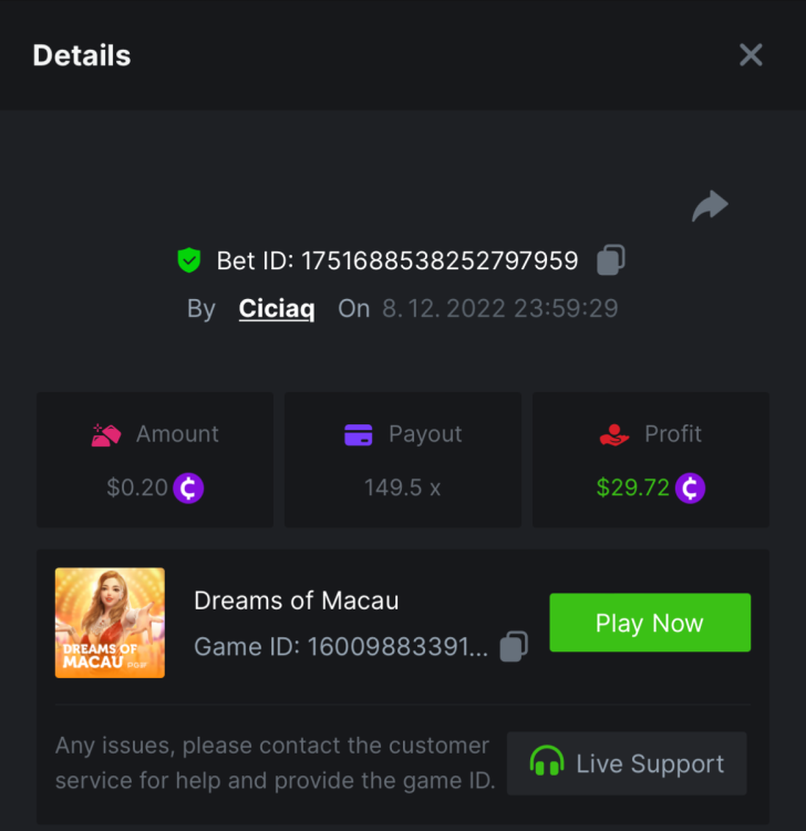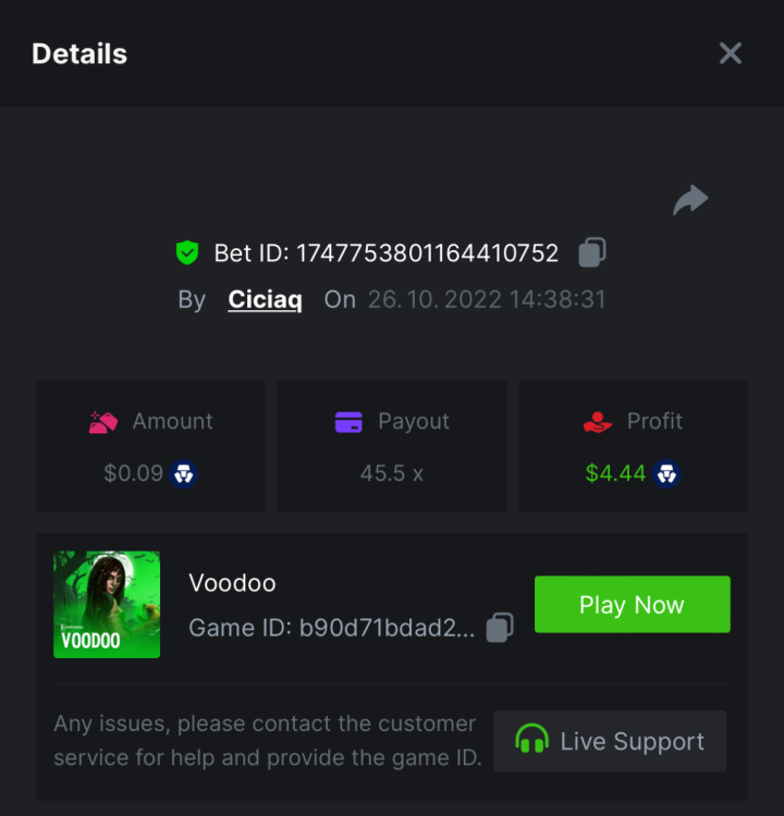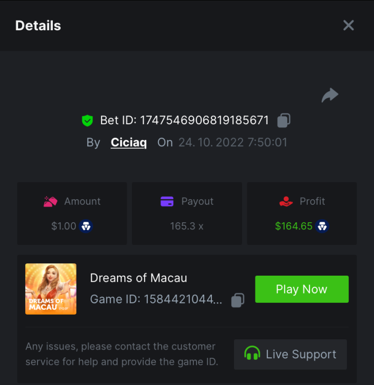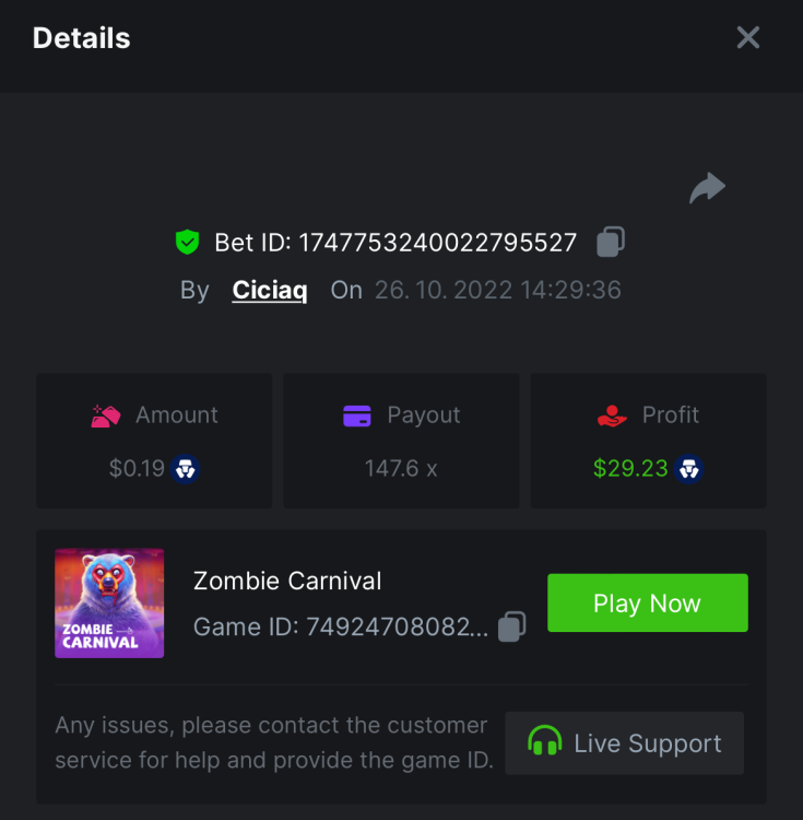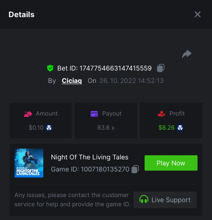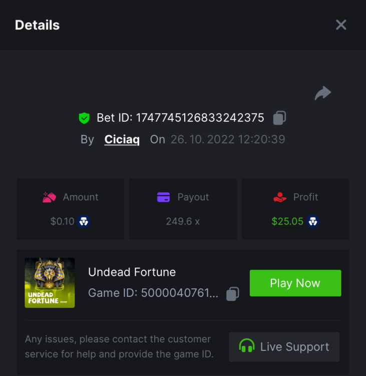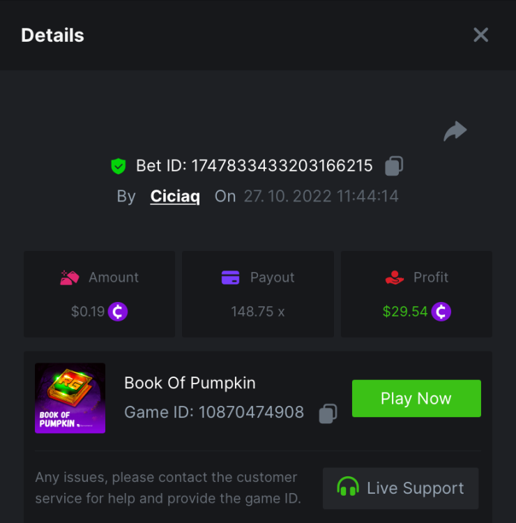 11. Book Of Muertos - 200.5x https://bc.game/#/sd/10WRANURH6N02B Fortuna de los Muertos II - 105.07x https://bc.game/#/sd/10WPRPZ7553TW3 Fortuna de los Muertos - 32.03x https://bc.game/#/sd/10WPYVPN9M54B7 Retro Muertos - 25.63x https://bc.game/#/sd/10WPL0Z9875FYR Book of Skulls - 101.59x https://bc.game/#/sd/10WPIWFN72UR6B Origins of Lilith - 108.72x https://bc.game/#/sd/10WPQDQWZSWETV