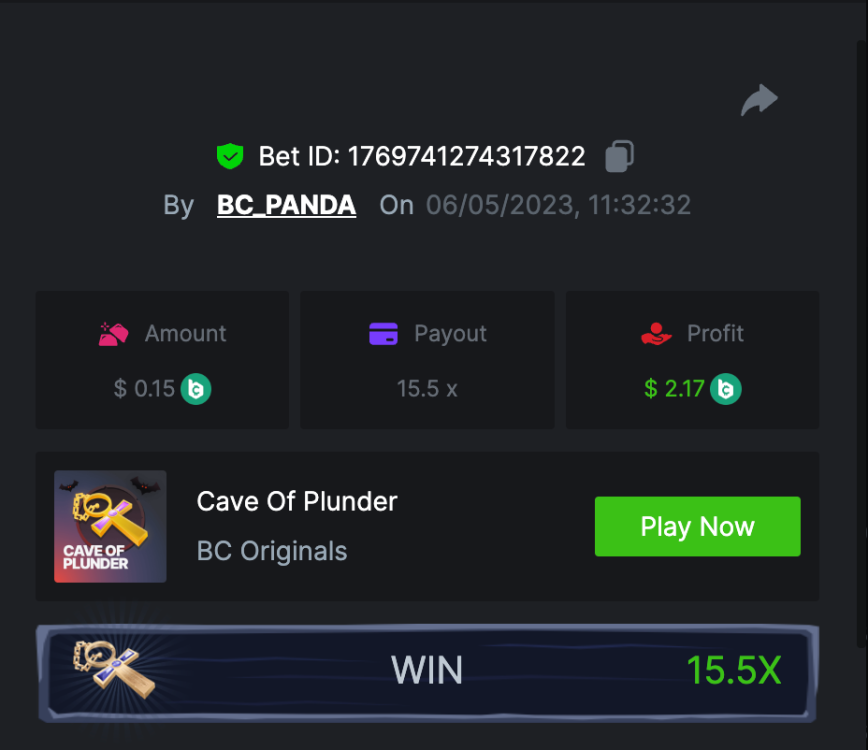 $5k Prestige CAVE Challenge #87 DURATION: 6th MAY - 12th MAY 09:00 am UTC This weeks Prestige Challenge is back with a long awaited game CAVE OF PLUNDER! Take part in this amazing yet challenging event to split prizes worth $5,000! Duration of this challenge will be from 6th MAY - 12th MAY 09:00 UTC. Don't forget to read all terms below to find out how to participate in this event. Good Luck! What's the Challenge? Capture a multiplier - 7.5x or higher on the Cave of Plunder Game. Make sure you get your multiplier captured on my bets section. The highest multiplier will be considered. If a tie occurs in the multiplier, the next ranking player with the higher average bet amount (in USD) being the 2nd winner and so on. If there is a tie in the amount and multiplier, the one who posted or edited his post first will be considered in the Ranking. How to Enter To enter, copy the link of the bet you'd like to submit. Once you've copied it, paste it as a reply to this thread like so: Link: https://bc.game/#/sd/11928W19XHY903 In the same post, upload a screenshot of your win by clicking the game ID WITH VIEW IN USD mode ENABLED (accessible at the bottom of dropdown menu for your wallet up top. This way, we can ensure that your bet indeed met the minimum requirement at the time of placing it: Link: https://bc.game/#/sd/11928W19XHY903 Minimum VIP Minimum VIP 4 with phone verified will be eligible! Minimum Payouts Minimum payout to qualify is 7.5x Minimum Bet Size $0.15 USD equivalent Eligible Coins All cryptocurrencies are eligible (excepting JB) Available Prizes GENERAL TERMS Please combine all of your hits together in a SINGLE post. Edit your existing post for additional hits, don't create a new post. Each eligible entry must have the Bet Slip URL, failure to include it will disqualify participation in the event. Bet Slip image is not mandatory. Bets must be posted within 24 hours of placing bet in order to keep things fair for everyone. Bets must be made during the specified time window stated above. This thread will lock automatically when the time period is over. One (1) entry per household. Anyone found attempting to win multiple prizes will be disqualified from this challenge as well as all future challenges. Failure to follow instructions will result in your submission being null and void. By entering this challenge, you acknowledge that BC.Game has the final decision on results and placement. Payouts will be distributed after the event is finished. Please note that it could take anywhere between 24 hours to 7 days after the completion of the event.