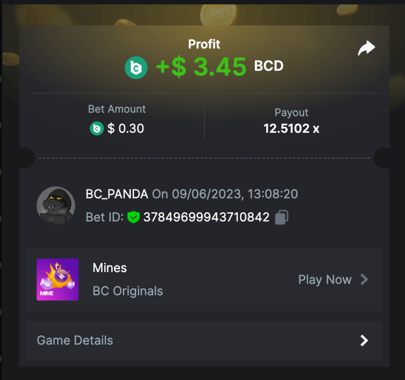 $5k Prestige Mines Challenge #92 DURATION: 9th JUNE - 16th JUNE 10:00 am UTC Welcome back, VIP's, this week, you are going to face the Prestige Challenge with your Mines. his week, we have a thrilling Mines tournament focused on highest multipliers. The rules are straightforward, and the prize pool is absolutely fantastic. Without further ado, let's jump right into the event. Take a look at the terms and conditions provided below: What's the Challenge? Win the highest multiplier you can on on BC.Game's in-house game, Mines. If there is a tie, the player with the higher average bet amount (in USD) shall be the winner. If there is a tie in the amount and payout, the one who posted or edited his post first will be considered in the Ranking How to Enter To enter, copy the link of the bet you'd like to submit. Once you've copied it, paste it as a reply to this thread like so: Link: https://bc.game/#/sd/11BENSXEXH2GWJ In the same post, upload a screenshot of your win by clicking the game ID WITH VIEW IN USD mode ENABLED (accessible at the bottom of dropdown menu for your wallet up top. This way, we can ensure that your bet indeed met the minimum requirement at the time of placing it: Link: https://bc.game/#/sd/11BENSXEXH2GWJ Minimum VIP Minimum VIP 4 with phone verified will be eligible! Minimum Payouts Minimum payout to qualify is 10x Minimum Bet Size $0.30 USD equivalent Eligible Coins All cryptocurrencies are eligible (excepting JB) Available Prizes GENERAL TERMS Please combine all of your hits together in a SINGLE post. Edit your existing post for additional hits, don't create a new post. Each eligible entry must have the Bet Slip URL, failure to include it will disqualify participation in the event. Bet Slip image is not mandatory. Bets must be posted within 24 hours of placing bet in order to keep things fair for everyone. Bets must be made during the specified time window stated above. This thread will lock automatically when the time period is over. One (1) entry per household. Anyone found attempting to win multiple prizes will be disqualified from this challenge as well as all future challenges. Failure to follow instructions will result in your submission being null and void. By entering this challenge, you acknowledge that BC.Game has the final decision on results and placement. Payouts will be distributed after the event is finished. Please note that it could take anywhere from 48 hours to 7 days after the completion of the event.