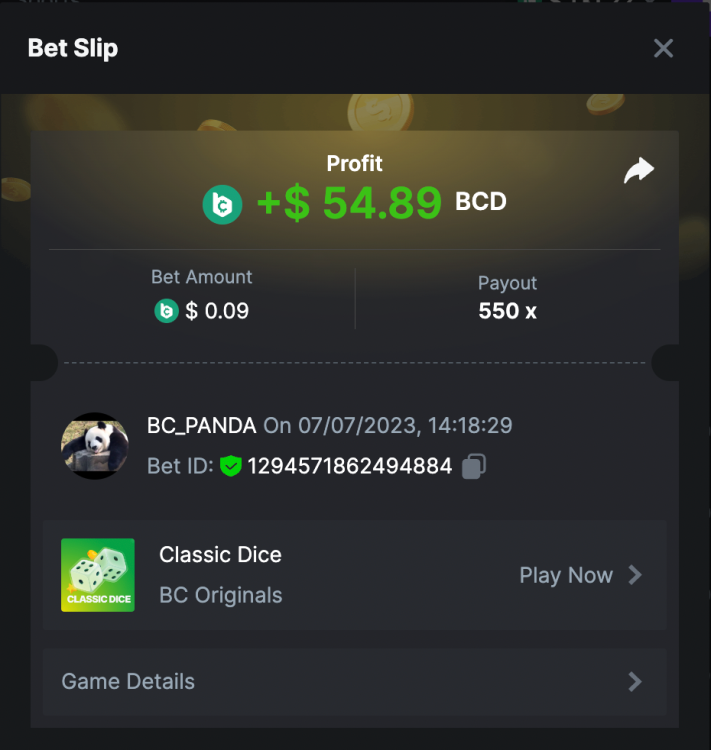 $5k Prestige Classic Dice Challenge #96 DURATION: 7th JULY - 14th JULY 12:30 pm UTC Welcome VIPs! Get ready to seize the moment and embrace the thrill! Brace yourselves for the electrifying Classic Dice challenge! Your mission? Conquer 25 precise target payouts and unite as a formidable force, amassing a colossal 1 point (with a maximum of 16 points)! But that's not all – the prize pool of $5,000 awaits those who dare to take part in this extraordinary and audacious event! Prepare yourselves, for life is a daring adventure, filled with untold possibilities. It's time to cast away doubt and hesitation, and let the dice guide your destiny! Let the games begin! What's the Challenge? Complete as many of the following 25 payouts on our in-house Classic Dice. Must be a winning bet. | 5x | 15x | 25x | 33x | 44x | 55x | 66x | 75x | 90x | 99x | 100x | 150x | 180x | 220x | 300x | 330x | 396x | 450x | 550x | 825x | 900x | 1100x | 2475x | 3300x | 4950x | Each payout you hit above counts as 1 point (Maximum 1 point for each payout). If there is a tie, the player with the higher average bet amount (in USD) shall be the winner. How to Enter To enter, copy the link of the bet you'd like to submit. Once you've copied it, paste it as a reply to this thread like so: Link: https://bc.game/#/sd/11DC5WGXAYR1G3 In the same post, upload a screenshot of your win by clicking the game ID WITH VIEW IN USD mode ENABLED (accessible at the bottom of dropdown menu for your wallet up top. This way, we can ensure that your bet indeed met the minimum requirement at the time of placing it: Link: https://bc.game/#/sd/11DC5WGXAYR1G3 Minimum VIP Minimum VIP 4 with phone verified will be eligible! Eligibility to Win Prize Win at least 4 payouts to qualify. Minimum Bet Size $0.10 USD equivalent Eligible Coins All cryptocurrencies are eligible (excepting JB) Available Prizes GENERAL TERMS Please combine all of your hits together in a SINGLE post. Edit your existing post for additional hits, don't create a new post. Each eligible entry must have the Bet Slip URL, failure to include it will disqualify participation in the event. Bet Slip image is not mandatory. Bets must be posted within 24 hours of placing bet in order to keep things fair for everyone. Bets must be made during the specified time window stated above. This thread will lock automatically when the time period is over. One (1) entry per household. Anyone found attempting to win multiple prizes will be disqualified from this challenge as well as all future challenges. Failure to follow instructions will result in your submission being null and void. By entering this challenge, you acknowledge that BC.Game has the final decision on results and placement. Payouts will be distributed after the event is finished. Please note that it could take anywhere between 24 hours to 7 days after the completion of the event.