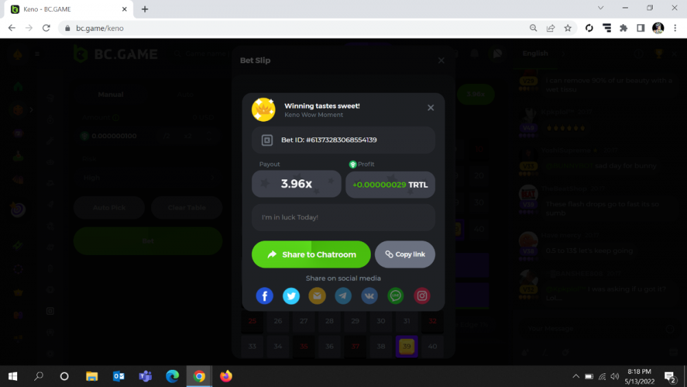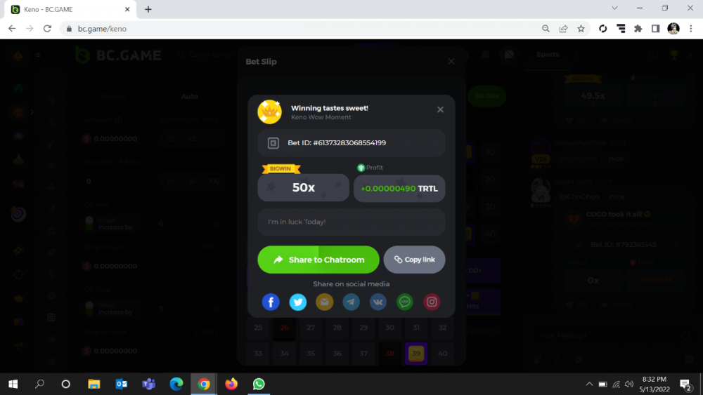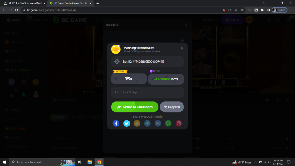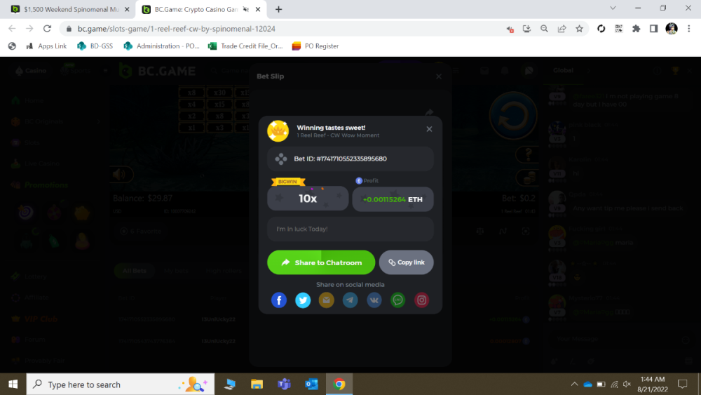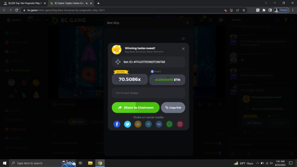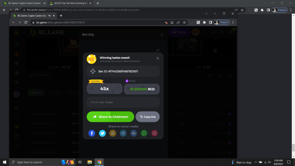 https://bc.game/sd/?sd=10KCTT2DWVITQR The bet amount was .00001 equivalent but because of decreasing coin value it shows .00000964