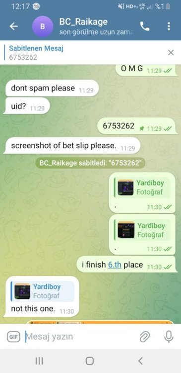 I won the "100x sword 10 winner 3bcd" event organized by @BC_Raikage by submitting my bet ID as 6th. @BC_Raikage congratulated me on completing it. and then forgot to add my id to the list. Even though I warned him, he did not add it and the event, which lasted another 20 minutes, was finally concluded. Even though I told him that my ID number was still not on the list, he did not add it and blocked me from Telegram and Global Chat to suppress his own mistake..