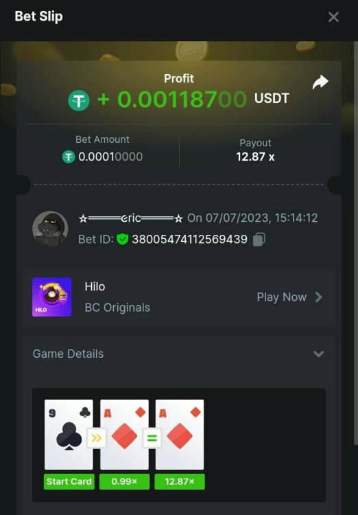 5. چالش 125 دلاری بازی هایلو / HiLo : چالش گرفتن بالاترین ضریب در بازی هایـــــلو و مجموع ضرایب ارسالے . هر ڪاربر مجاز به ارسال 2 اسڪرین شات مے باشد . مجموع 2 ضریب به اشتراڪ گذاشتہ شده ، به عنوان امتیاز ڪاربر در نظر گرفتہ خواهد شد : شرایط چالش حداقل پایہ شرط : مینیموم تمامے ارزها به جز جی بی - ✫ حداقل سطح ڪاربر : تمامے لول ها - ✫ حداقل امتیاز قابل قبول : 99 امتیاز مےباشد - ✫ : نڪات مهم ڪاربر مجاز بہ رد ڪردن ڪارتہا مے باشد .✪ از ارسال شاتہای اضافے و قدیمے برای هر ضریب ، خوددارے ڪنید .✪ ارسال لینڪ شرطہا بہ همراه شات اسڪـــرینہا الزامے مے باشد .✪ ادیت ریپلاے ها مجاز نمے باشد .✪ در صورت عدم رعایت قوانین فوق ،از چالش حذف شده و در صورت ارسال شات تڪراری ، آن ضریب لحاظ نخواهد شد .✪ در صورت تساوی امتیازات ، بازیڪنے ڪہ پایہ شرط اولیـــن شات ارسالے اش بیشتر باشد (از نظر دلاری) برنده خواهد بود . اگر در امتیاز و پایہ شرط ها هم مساوی باشند ، ڪسے ڪہ اولین شات خود را زودتر ارسال ڪرده است در رتبہ بندے بالاتر در نظر گرفتہ مے شود . ═══════ ◦ ★ ◦ ═══════ جوایز نفر اول : برنده 50 دلار نفر دوم : برنده 25 دلار نفر سوم : برنده 15 دلار نفرات چہارم و پنجم : نفری 6 دلار نفرات ششم تا یازدهم : نفری 3 دلار نفرات دوازدهم تا شانزدهم : نفری 1 دلار زمان پایان چالش : شنبہ 2 مہر / 24 سپتامبر ساعت 23:59 نمونه شرط ارسالی : https://hash.game/sd/?sd=10HXTS13ILFUOJ