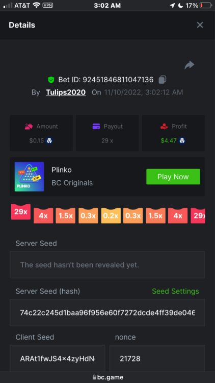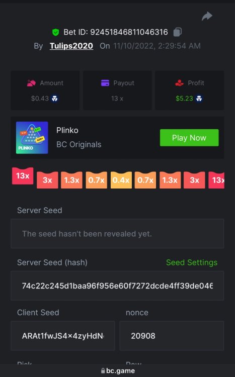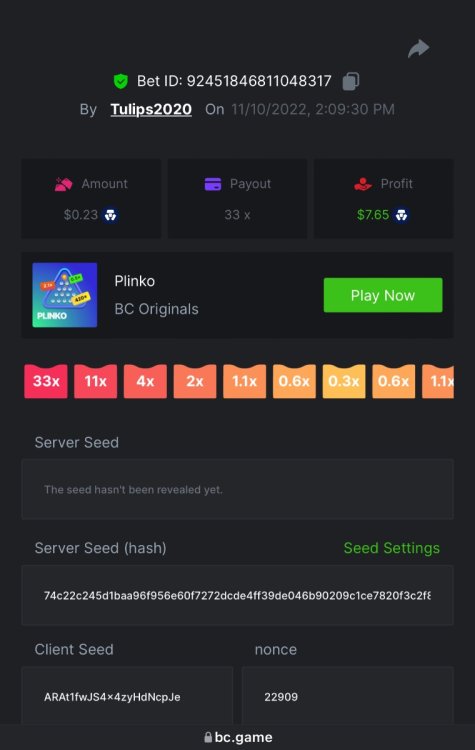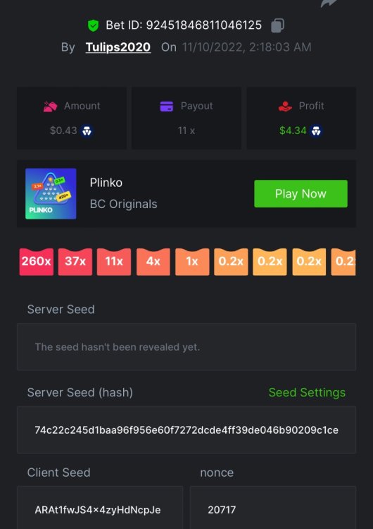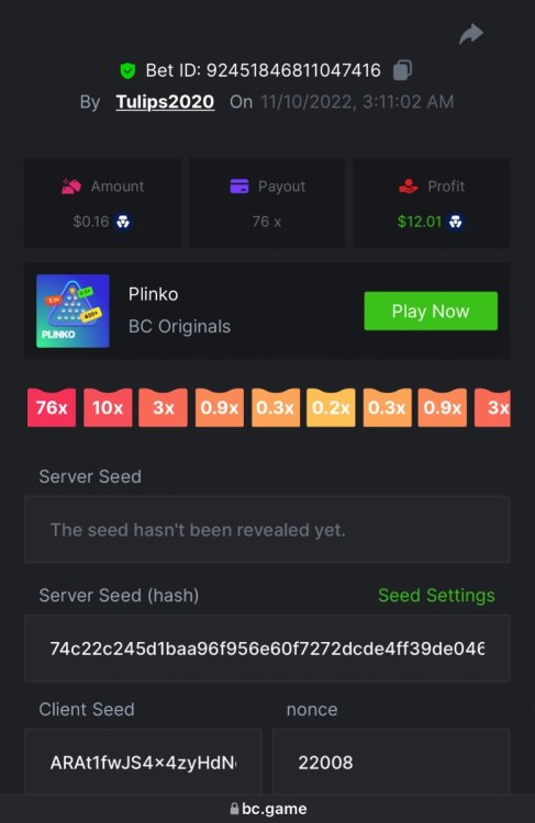 1. | 11x| 13x | 22x | 29x | 33x | 43x | 58x | 76x | 88x | 110x | 120x | 170x | 260x | 420x | 620x | 1000x | {5 Points} Phil the Plinko Ball has had a rough day. 11 https://bc.game/#/sd/10WVXUF7999AFN 13 https://bc.game/#/sd/10WVYIY0QPK5QR 29 https://bc.game/#/sd/10WW0IWMO8064Z 76 https://bc.game/#/sd/10WW12I7CBF21F https://bc.game/#/sd/10WX5VOC5GZ2FN .